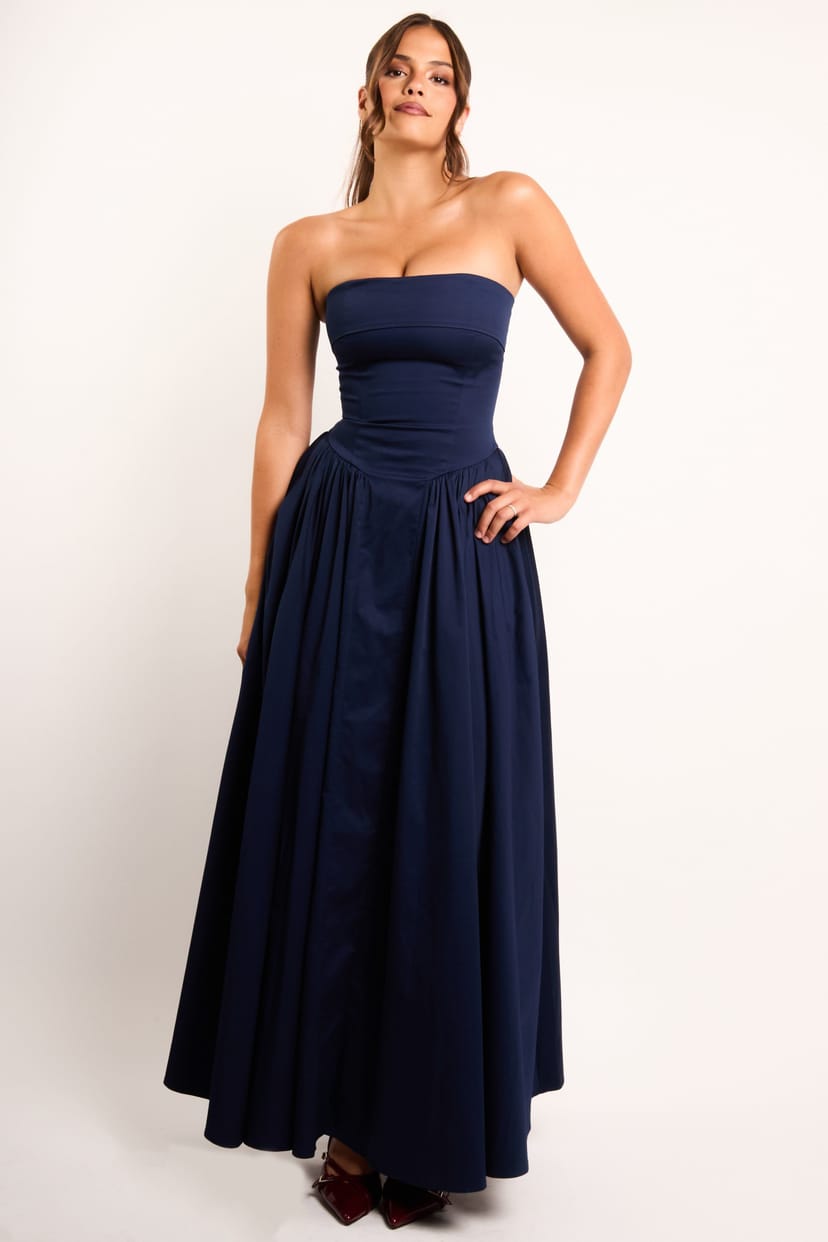 Timeless elegance meets understated drama in the Edith Deep Blue Bandeau Corset Maxi Dress. Designed in a soft navy hue, this showstopping style features a structured corset bodice with a folded bandeau neckline for a modern, sculpted silhouette. The full, layered cotton skirt is cut to sweep the floor.
