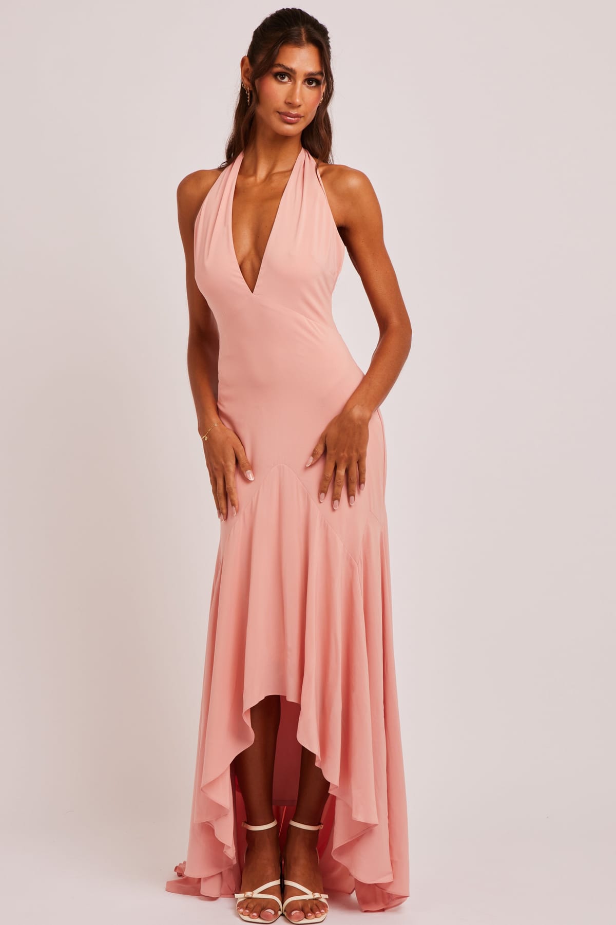A dusty pink chiffon maxi dress with a plunging halter neckline and godet detailing. The airy fabric flows beautifully, perfect for evening events or special occasions.