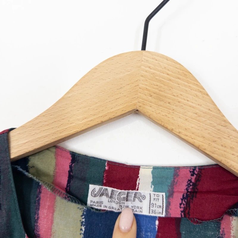 The Jaeger 70s Vintage Cotton Blouse in Multicoloured Arty Print is available in sizes S.
