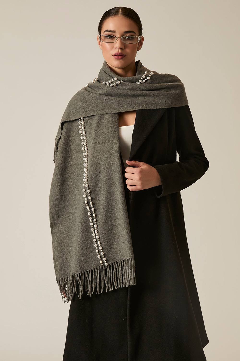 The James Lakeland Charcoal Pearl Detail Scarf is ideal for casual, evening, winter.