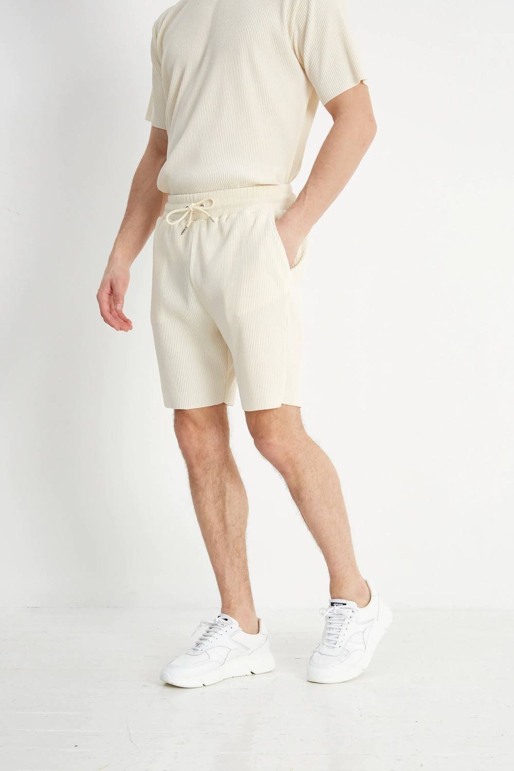Stylish cream pleated shorts with a relaxed fit and minimal aesthetic. Perfect for summer, these shorts feature an elasticated waistband and adjustable drawcord fastening. Pair with the matching RENOIR Pleated Twin Set T-shirt for a complete look.