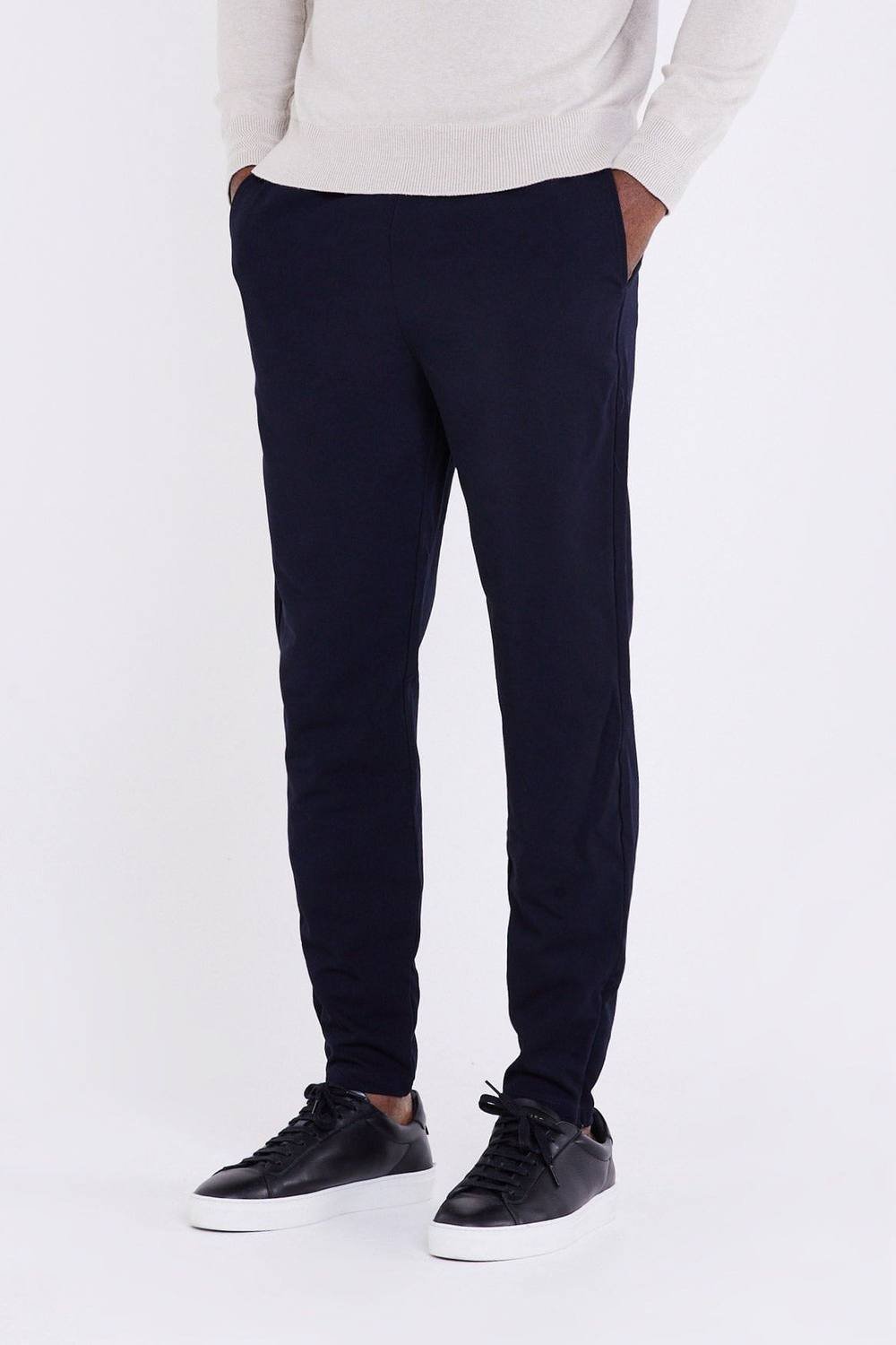 Stylish Navy chino pants with a premium soft touch woven fabric. Features an elasticated waistband and premium silver hardware finishing. Ideal for a relaxed fit and comfortable wear.