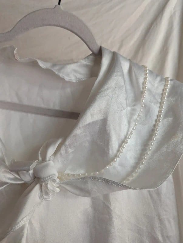 Vintage Japan Style blouse in white satin with delicate pearl detailing around the collar. A one-size fit, perfect for a medium to large size.