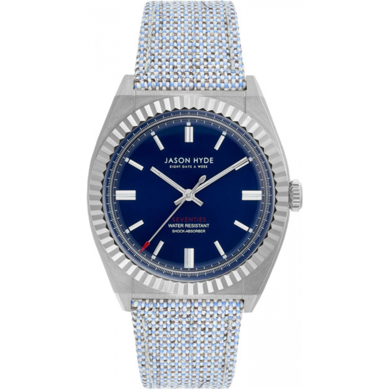 Stylish Jason Hyde men's watch with a multicolor mesh strap and a blue dial. Features water resistance and a shock-absorber for durability. Ideal for casual and formal occasions.