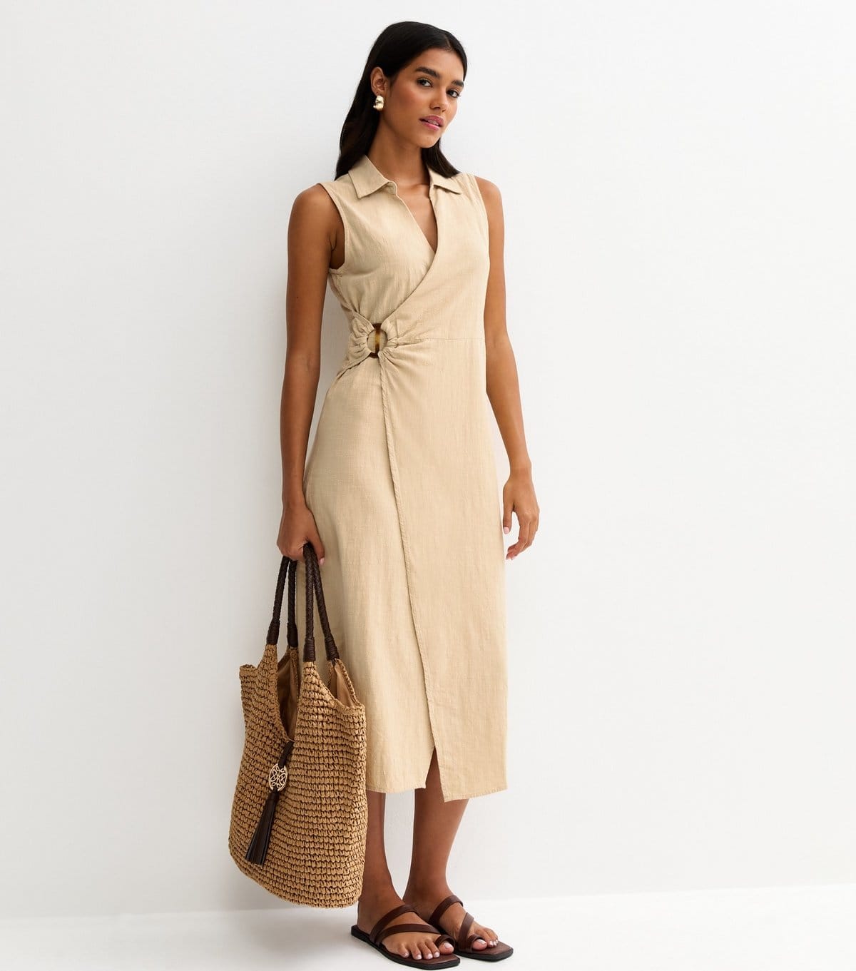 “Pair with brown leather sandals and a woven tote bag for a chic daytime look.”