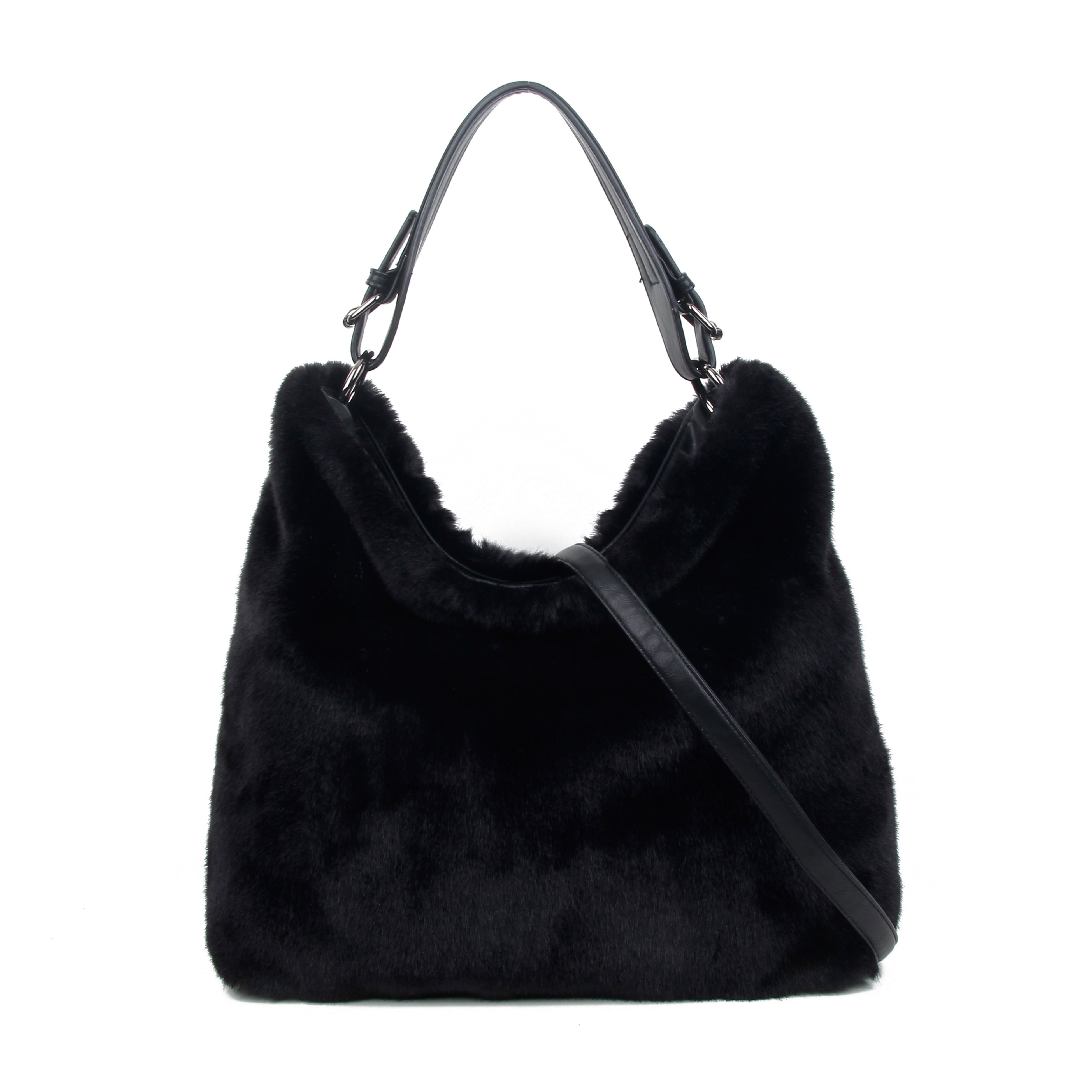 The JFY Women's Faux Fur Top Zip Closure Shoulder Bag in Black is made from faux fur, leather.