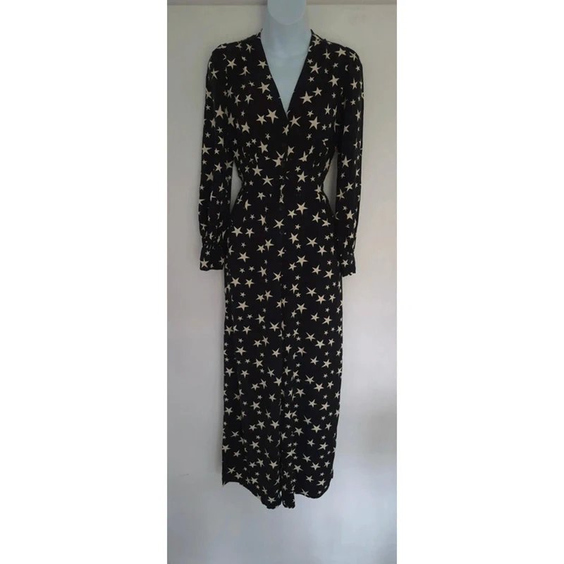 This Joanie Celestial Print V-Neck Jumpsuit in black is perfect for those who want to look effortlessly put-together with a vintage-inspired edge. Featuring a bold, cream-colored stars on a deep black background and a wide-leg cut, it offers a modern, flowy aesthetic. Ideal for a brunch date or a casual evening out.