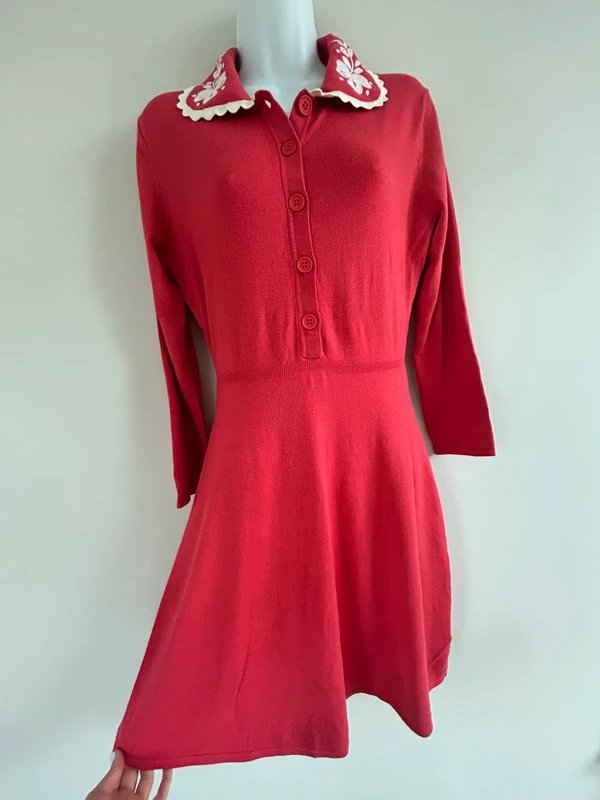 The Joanie Red Knitted Embroidered Collar Dress is available in sizes S.