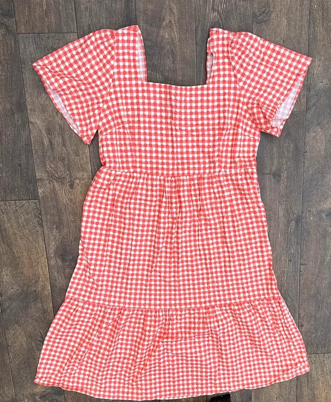 Designed in a coral and white gingham print, this midi dress from Joanie features a square neckline and short floaty sleeves. The tiered skirt adds a playful touch, perfect for summer outings.