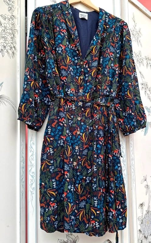 This Joanie midi dress features an all-over woodland print with foxes, deers, hedgehogs, and mushrooms. Made from LENZING™ ECOVERO, it's breathable and stylish. Ideal for casual outings and special occasions.