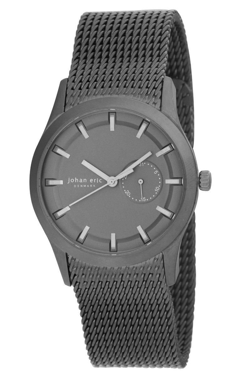 Sleek Johan Eric watch with a black dial and grey mesh bracelet. Features a date sub-dial, quartz movement, and IP case for durability. Perfect for a modern, minimalist look.