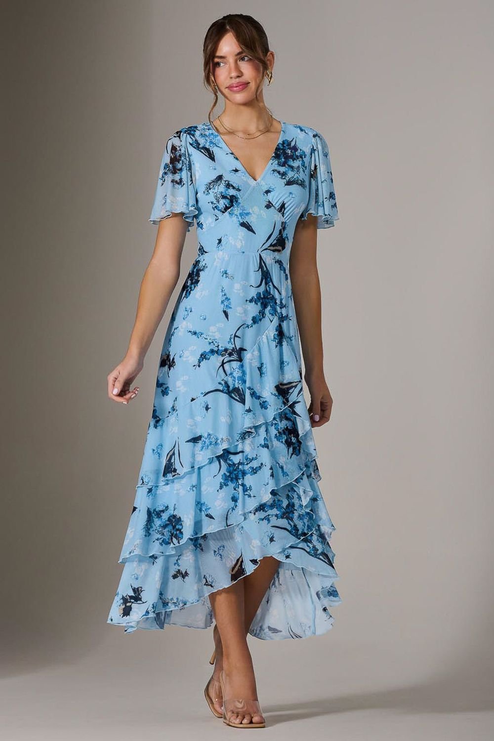 The Jolie Moi Baby Blue Mesh Print Frill Hem Midaxi Dress is ideal for evening, garden party, afternoon tea.