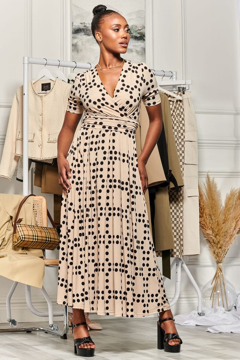 The Jolie Moi Beige Polka Dot Jersey Maxi Dress is ideal for casual, evening, date-night.