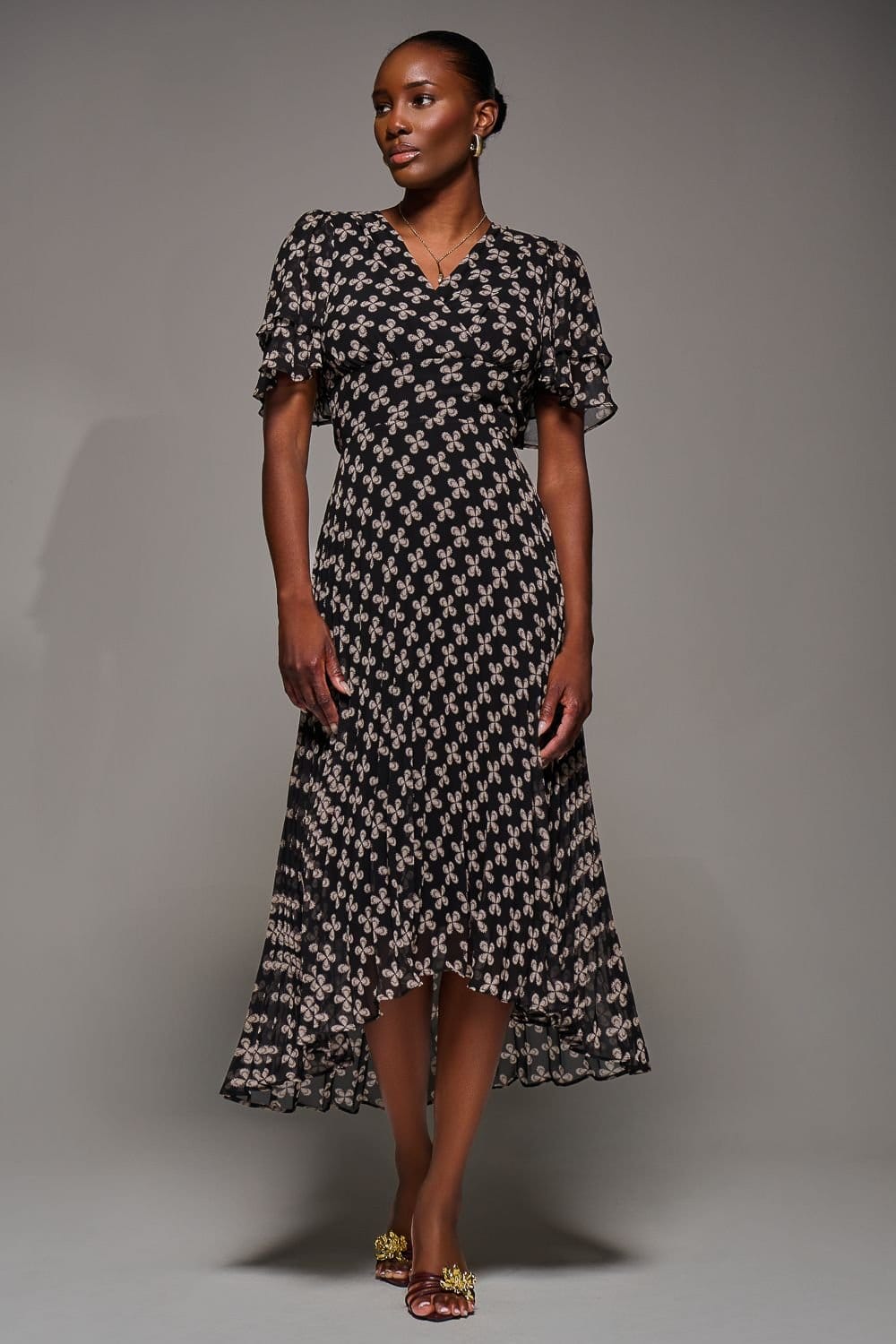 Charming midi dress in black with a floral print and ruffled angel sleeves. Features a flattering V-neckline and a pleated skirt with an asymmetric hem. Ideal for special occasions.