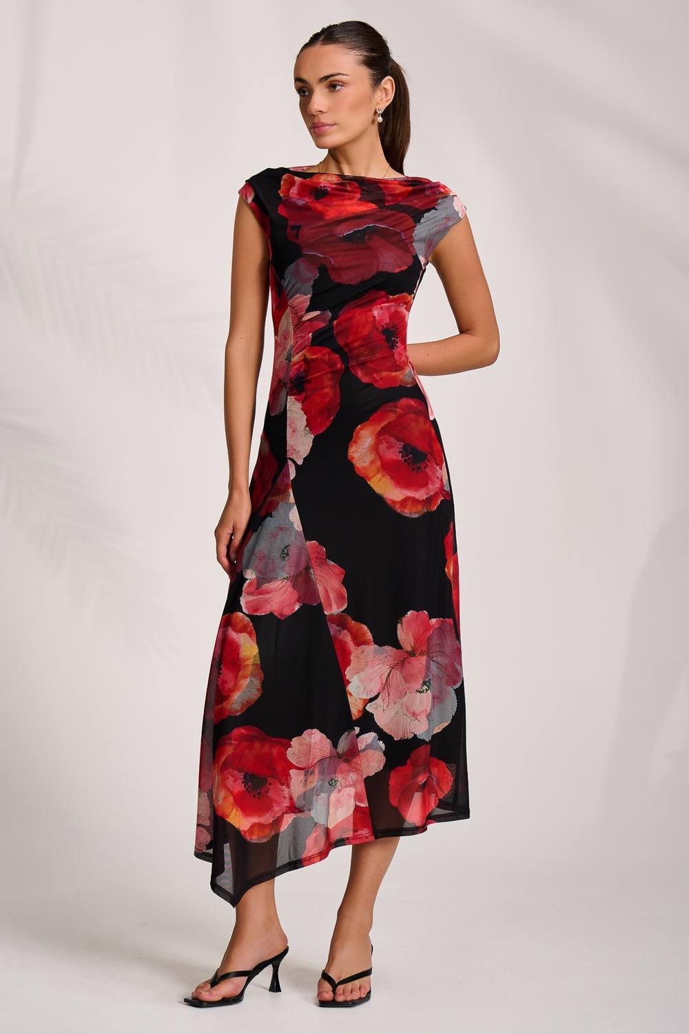 This black floral mesh midi dress by Jolie Moi features an asymmetrical draped design with a slash neckline and gentle gathering at the shoulder. The sleeveless silhouette is accentuated by a delicate fringed detail that cascades from the waist to the hem, creating a graceful and flowing look.