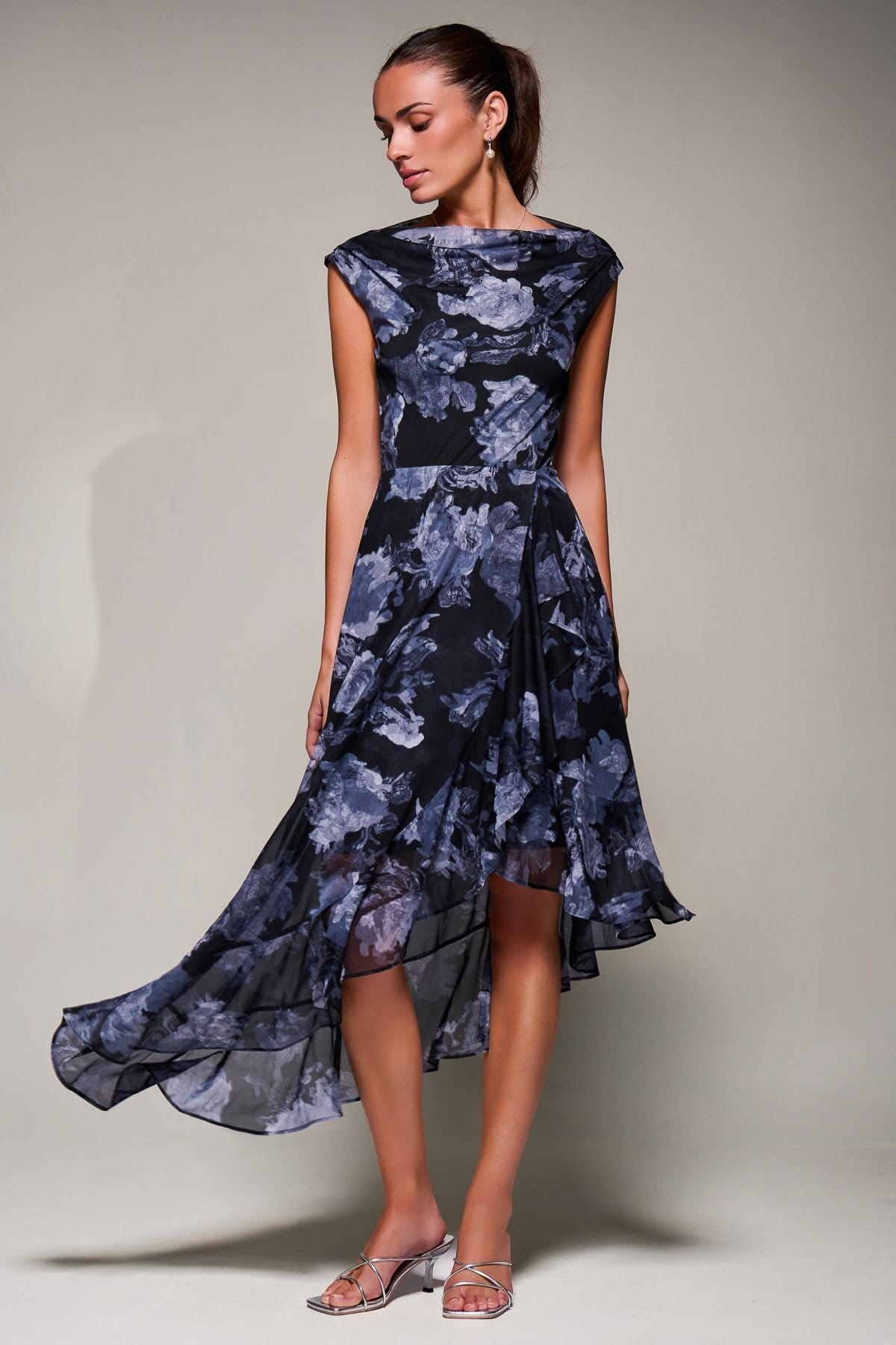 This black floral mesh midi dress by Jolie Moi features an asymmetrical neckline with gentle gathering at the shoulder. The sleeveless design is accentuated by a delicate frill that cascades from the waist to the hem, creating a graceful, flowing silhouette. Ideal for evening events or special occasions.