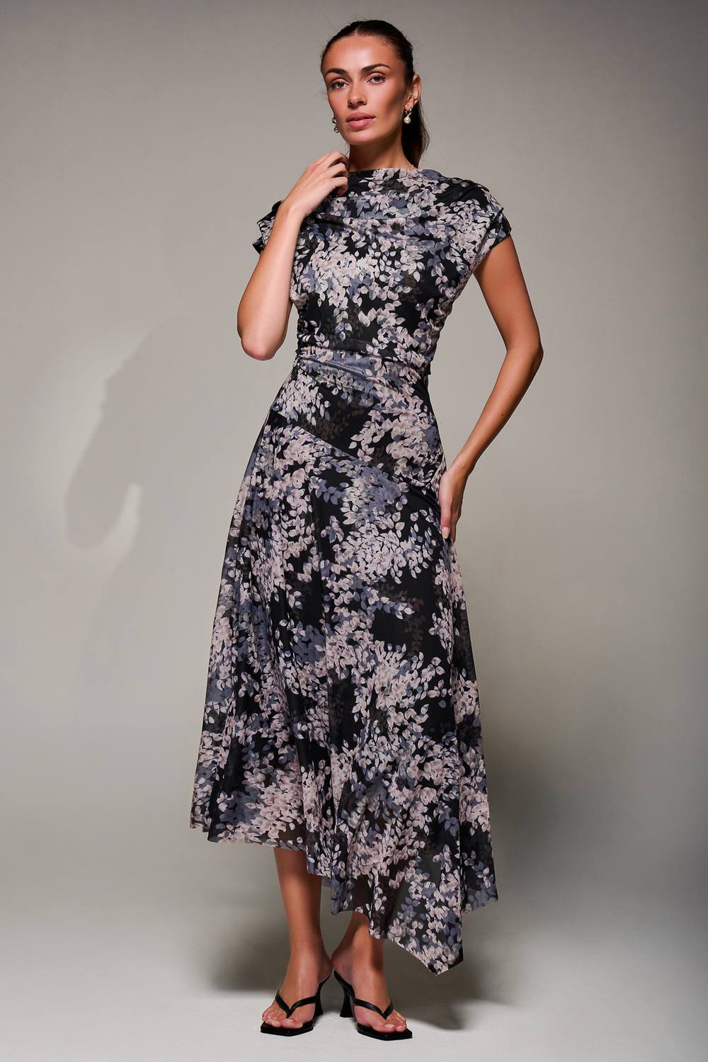 Stylish black floral print midaxi dress by Jolie Moi. Features an asymmetrical slash neckline, pleated shoulders, and waist gathers for a soft drape. Perfect for modern and timeless elegance.
