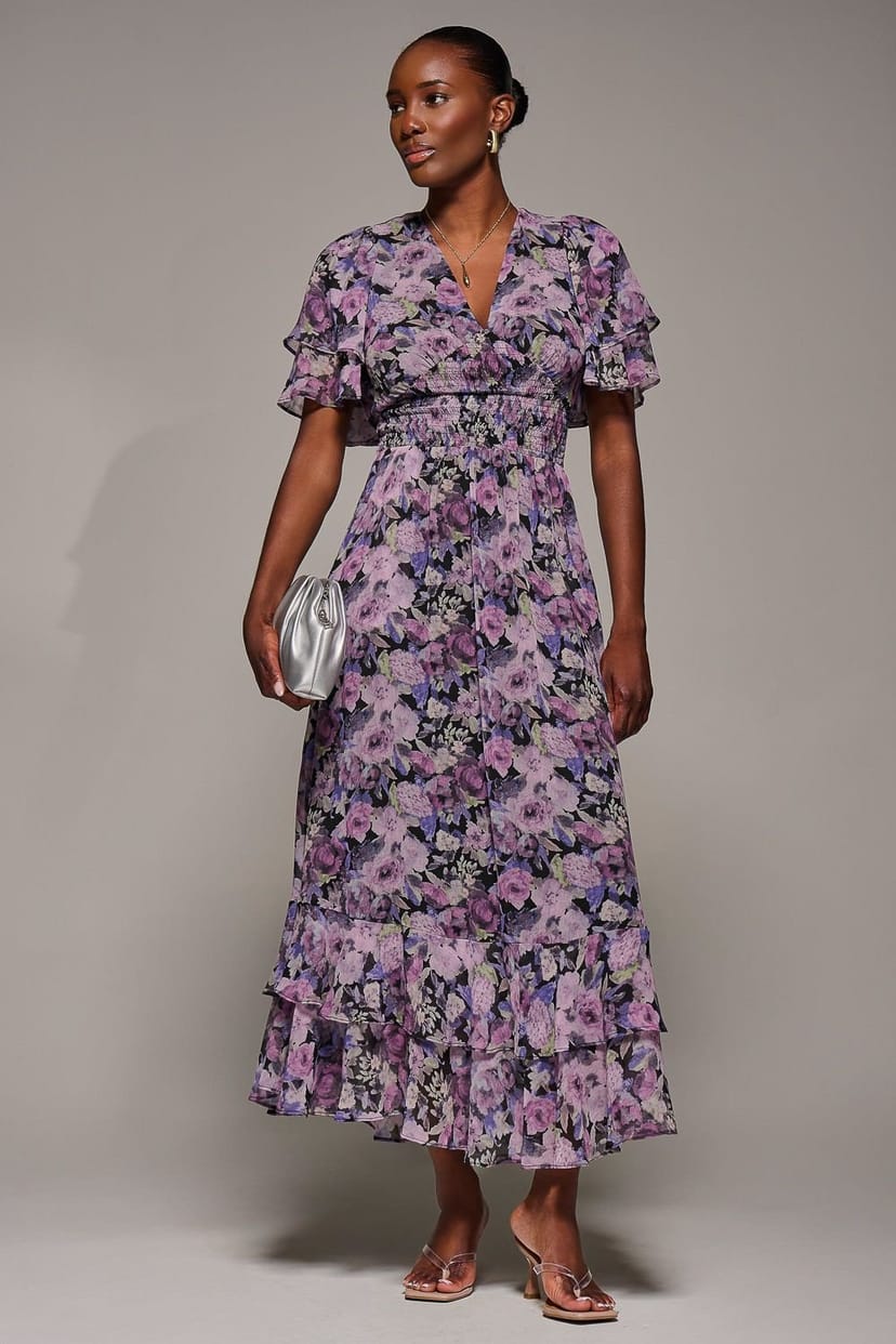 Charming midi dress in purple floral chiffon with a V-neckline and layered ruffle sleeves. The shirred waist adds a flattering fit, perfect for evening events or date nights.