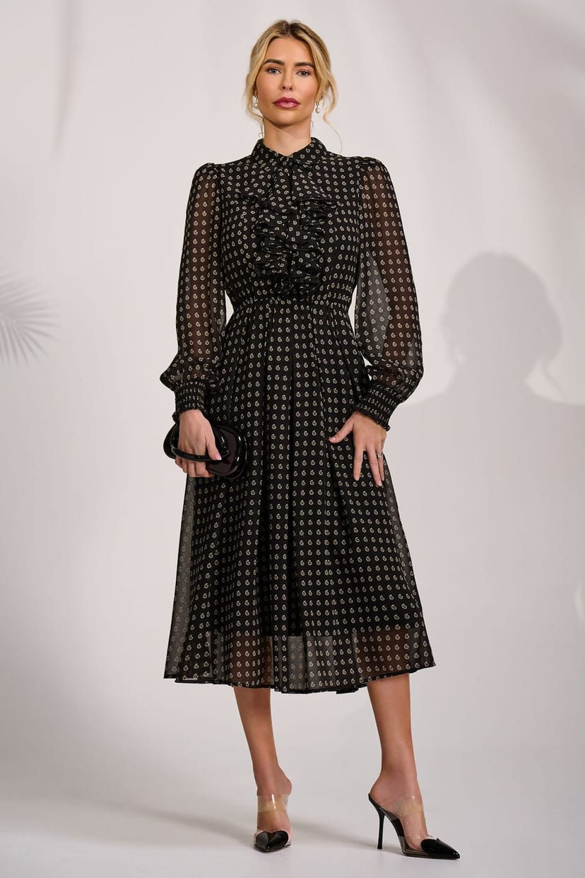 The Jolie Moi Black Chiffon Print Ruffled Shirt Dress is ideal for evening, date-night, party.