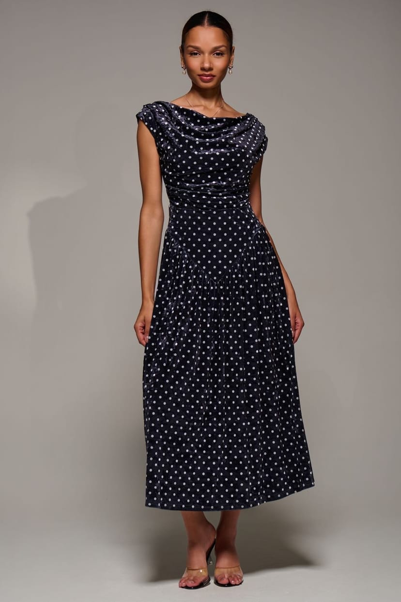 Elegant black polka dot velvet midi dress by Jolie Moi. Features a cowl neckline and sleeveless design. Perfect for evening events or special occasions.
