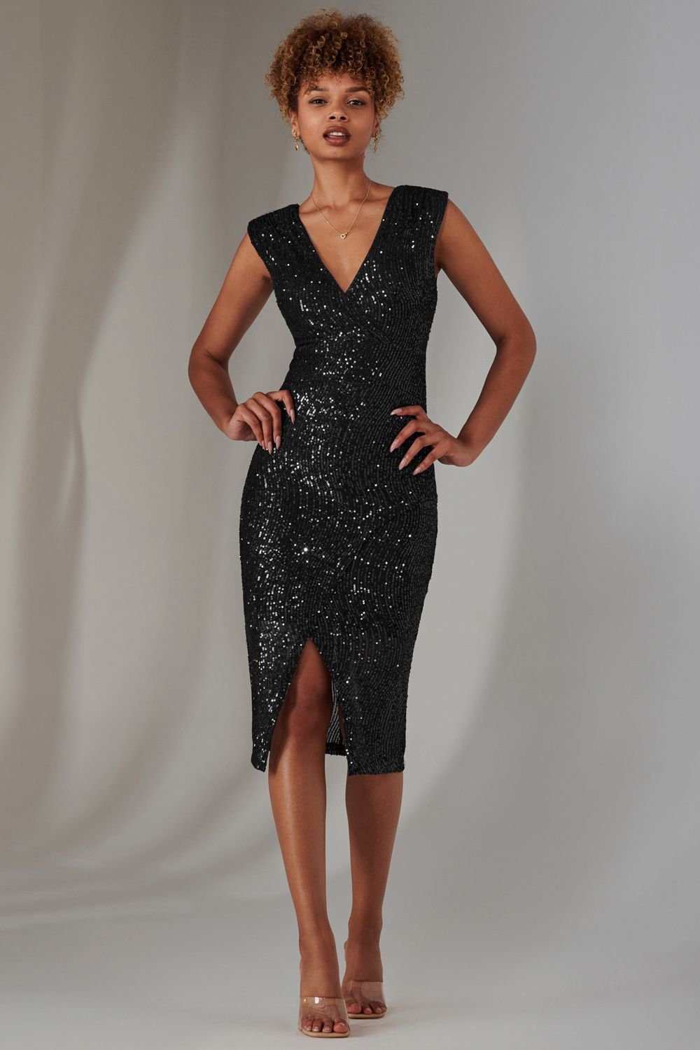 The Jolie Moi Black Sequin Midi Dress With Slit is made from sequin.