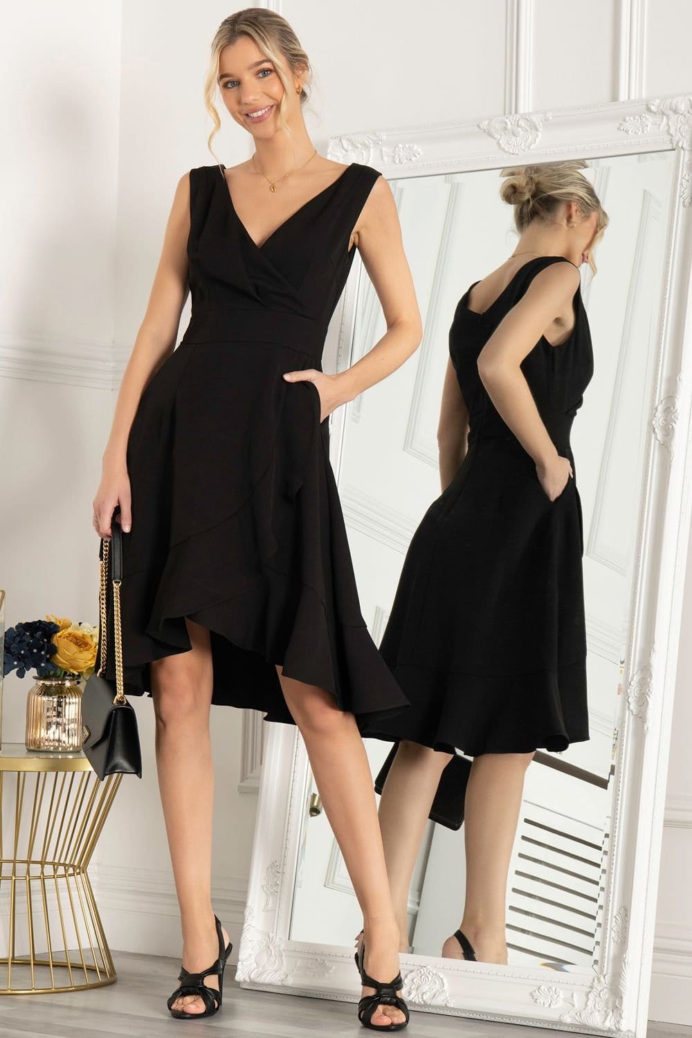 Stylish black sleeveless midi dress with a wrapped v-neckline and flounced ruffled hem. The perfect summer outfit for any event. Made from lightweight fabric for comfort.