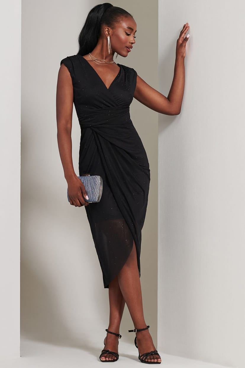 The Jolie Moi Black Embellished Ruched Mesh Midi Dress is ideal for evening, party, date-night.