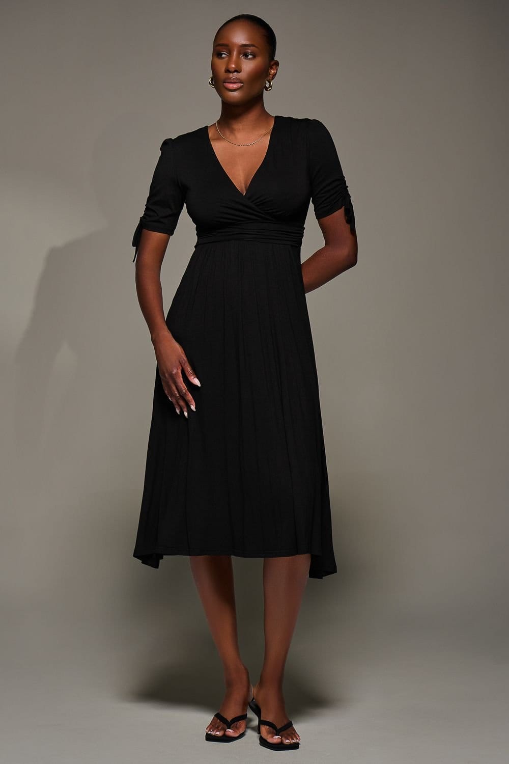 Stylish midi dress in black jersey by Jolie Moi. Features a flattering V-neckline and tie-detail sleeves that create a gathered effect. The front waistband is gently gathered to fit perfectly, while the ruched waistline adds a flattering silhouette with two discreet side pockets.