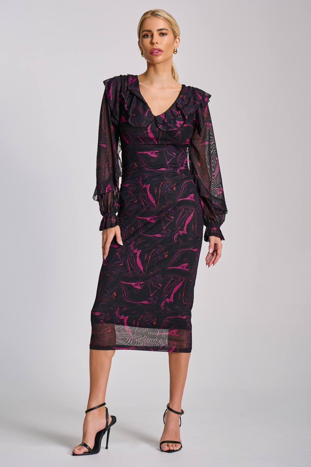 Striking black and pink abstract print bodycon dress with a V-neckline and long sheer ruffled sleeves. Made from mesh fabric, it is ruched at the waist and fully lined for a flattering fit. The midi length adds a chic touch, perfect for evening events.