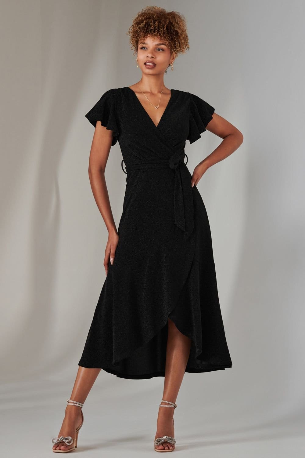 The Jolie Moi Black Metallic Maxi Dress with Angel Sleeves is ideal for evening, party, date-night.