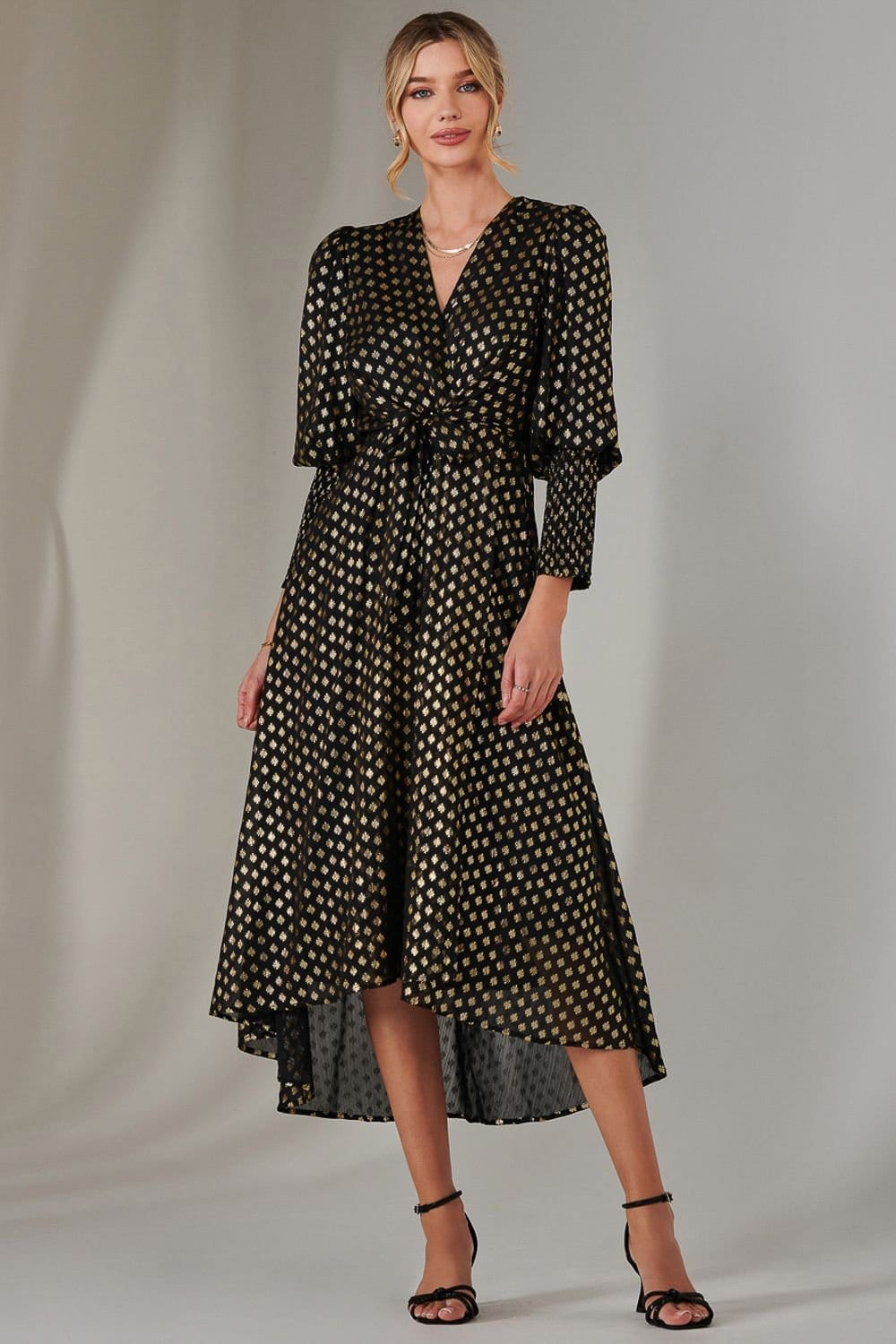 Elegant black metallic spot print maxi dress by Jolie Moi. Features full-length puff sleeves and a wrap-around neckline. Ideal for special occasions.