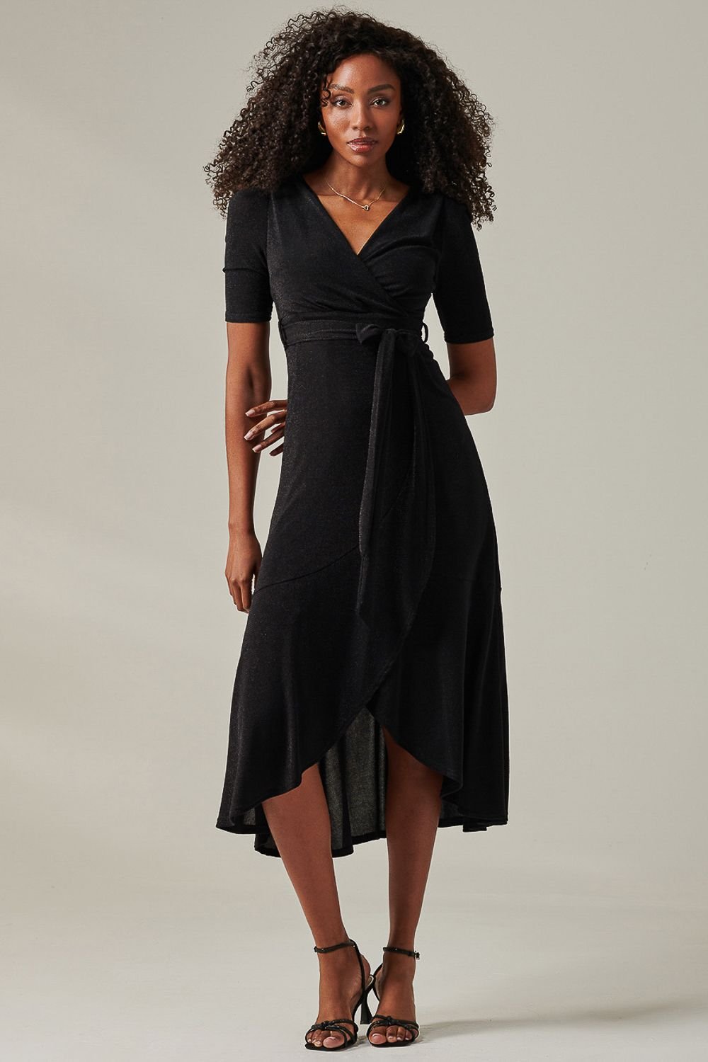 Stylish black metallic wrap-over dress with a flattering V-neckline and half sleeves. The self-tie waistband allows for a customizable fit, while two side pockets add practicality. Ideal for special occasions.