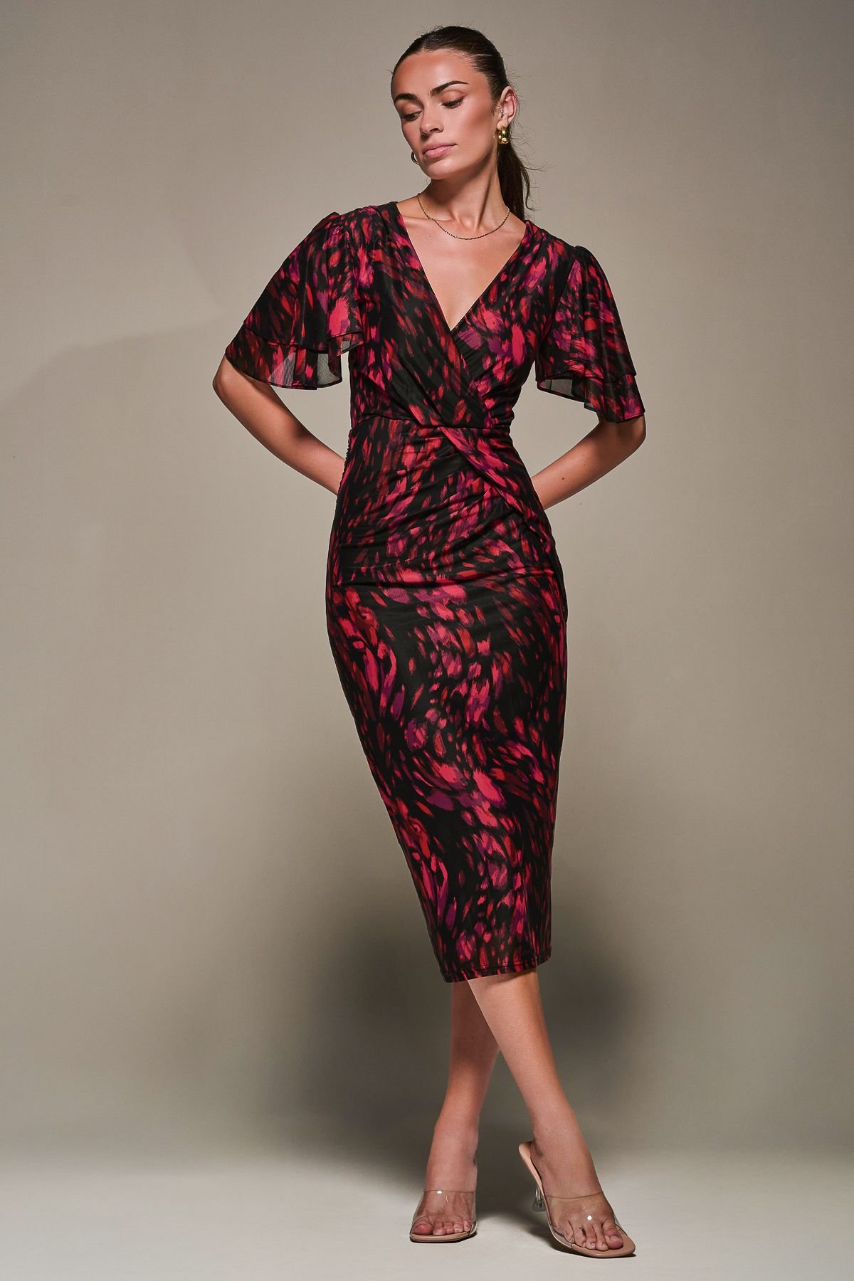 Stylish red print mesh bodycon midi dress with a V-neckline and ruffled sleeves. The pleated waist and double layered ruffle sleeves add an elegant touch. Perfect for evening events or date nights.