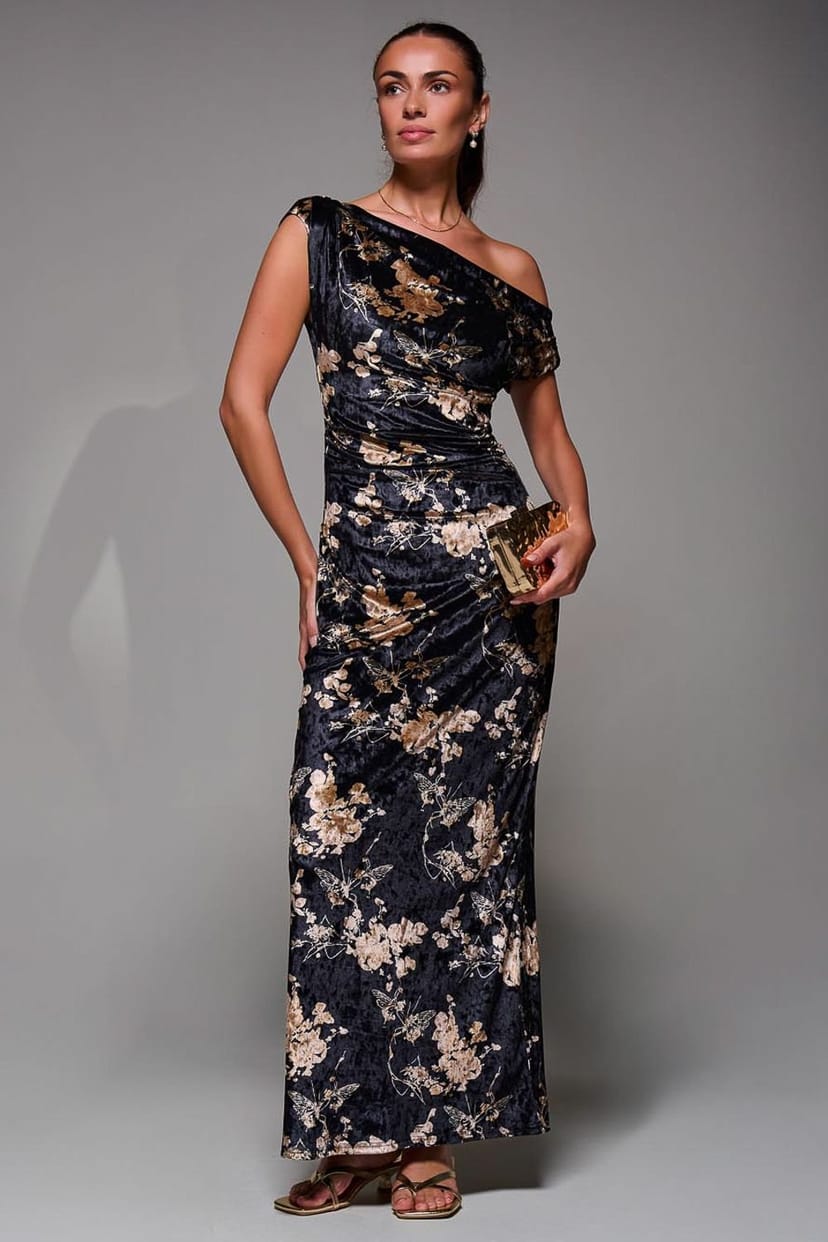 This Jolie Moi dress features an off-shoulder neckline and a maxi length. Made from luxurious printed velvet, it offers a flattering silhouette and is fully lined for comfort. The floral print adds an elegant touch, making it perfect for evening events.