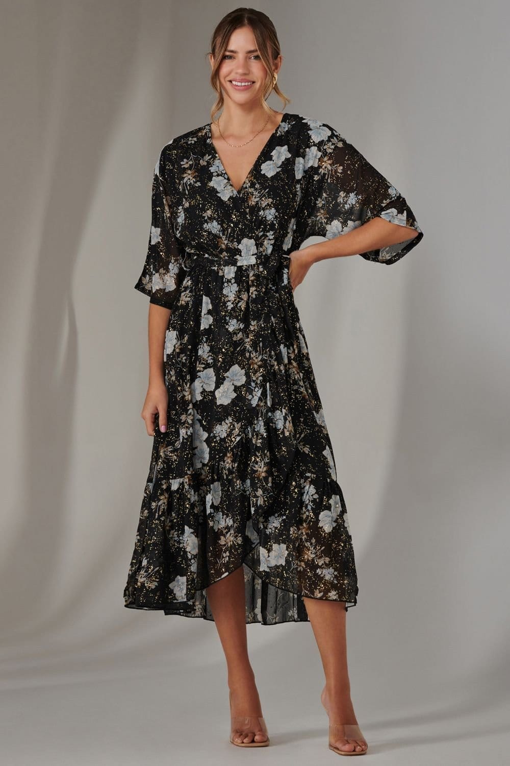 Glide into elegance with the Jolie Moi Black Floral Chiffon Midi Dress. A stunning blend of elegance and modern flair. Featuring a delicate floral print with metallic gold accents, this dress is perfect for special occasions. Its short kimono sleeves add a touch of sophistication, while the asymmetrical hemline adds a modern twist.