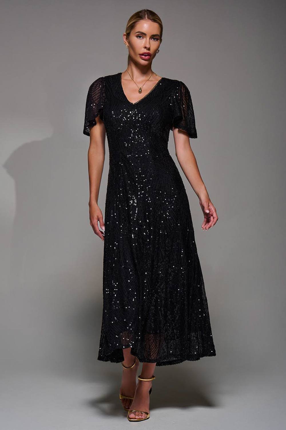 Glamorous midi dress in black sequin with a flattering V-neckline and short angel sleeves. Features a concealed zip fastening and frilly detailing for an elegant touch. Perfect for evening events.