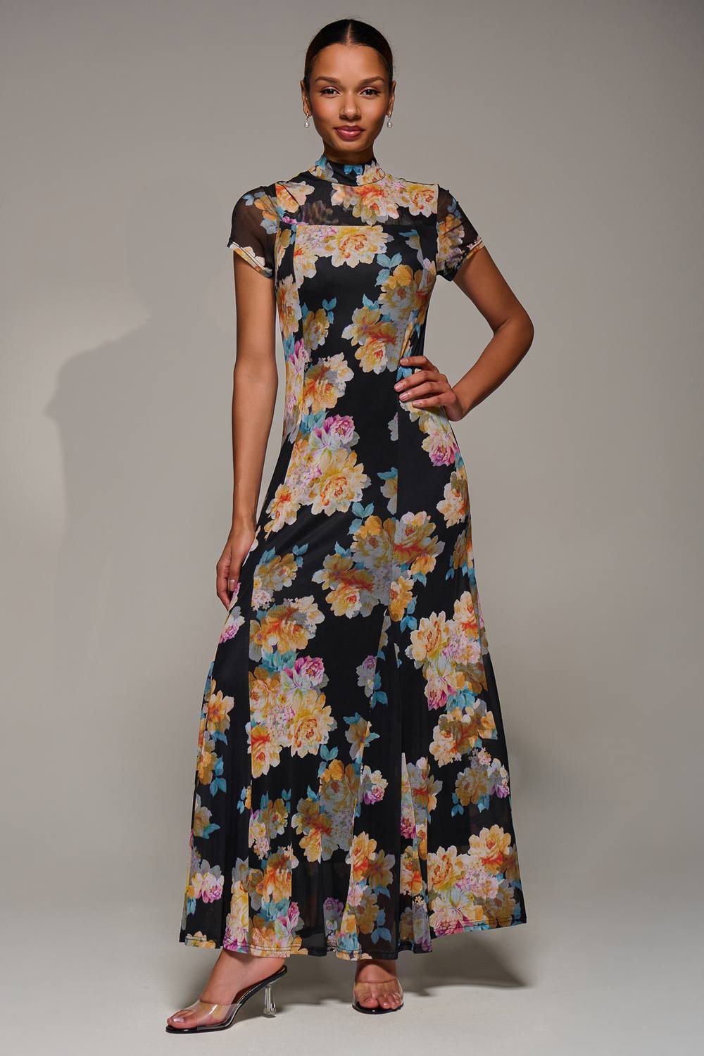 The Jolie Moi Black Floral Mesh Maxi Dress with Turtle Neckline is ideal for evening, date-night, party.