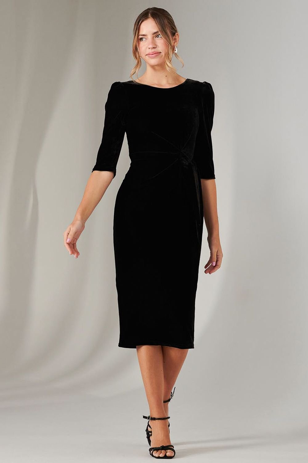 The Jolie Moi Black Velvet Midi Dress with Side Tie is ideal for evening, special occasions, date-night.