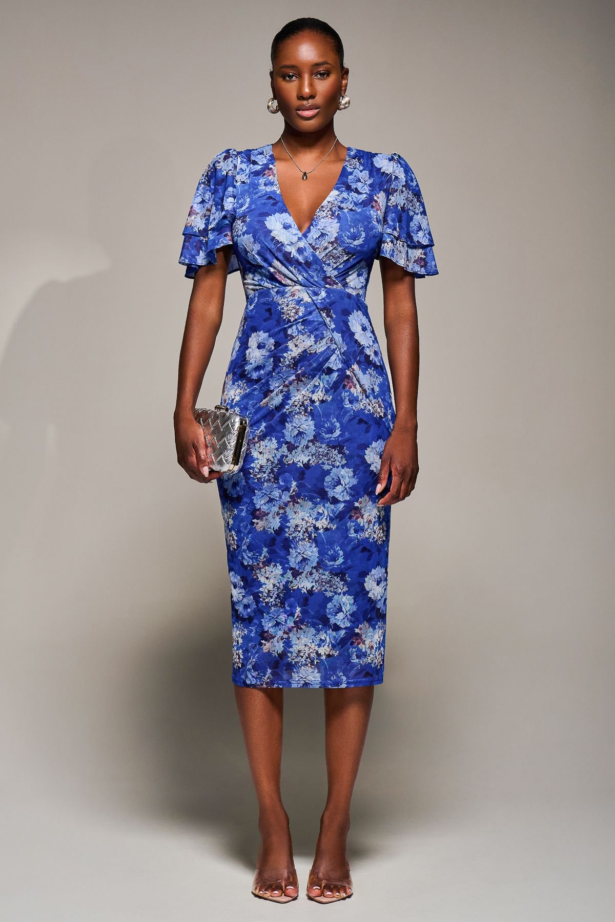Elegant blue floral print bodycon dress with a flattering silhouette. Features a V-neckline, angel sleeves, and pleated waist detailing. Perfect for evening events or special occasions.