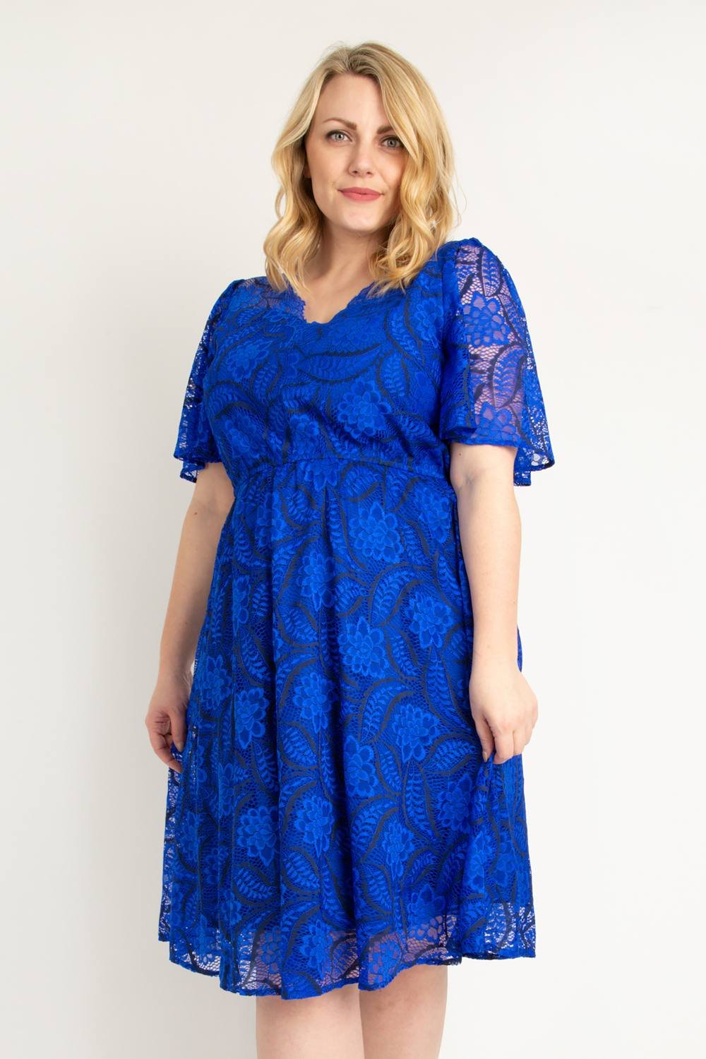 The Jolie Moi Blue Lace Midi Dress with Flare Sleeves is available in sizes 18.