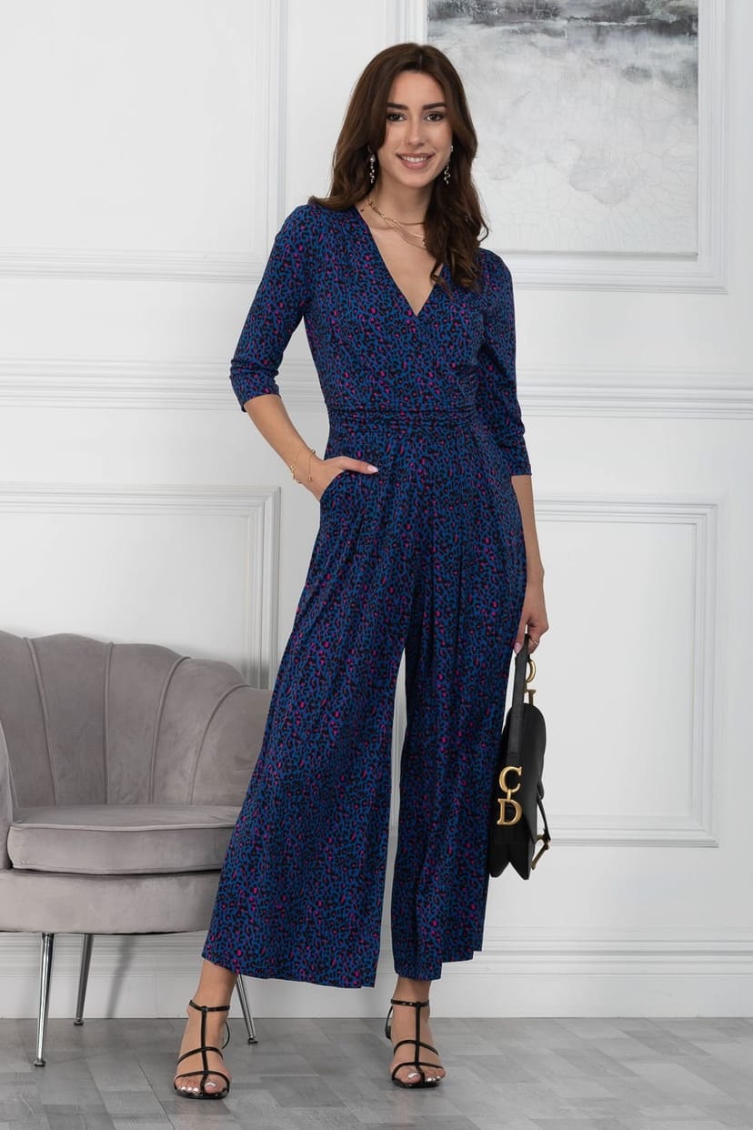 Stylish blue floral wrap jumpsuit with 3/4 length sleeves and a self-tie detail under the bust. Made from premium jersey fabric for comfort and style. Ideal for a classier look with heels.