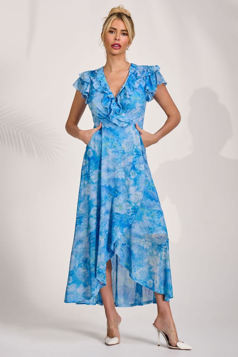 This blue floral mesh maxi dress by Jolie Moi features a wrap front V-neckline with delicate frills, soft ruffle cap sleeves, and a wrap front skirt with frill detailing. Fully lined for comfort, it's perfect for evening events.