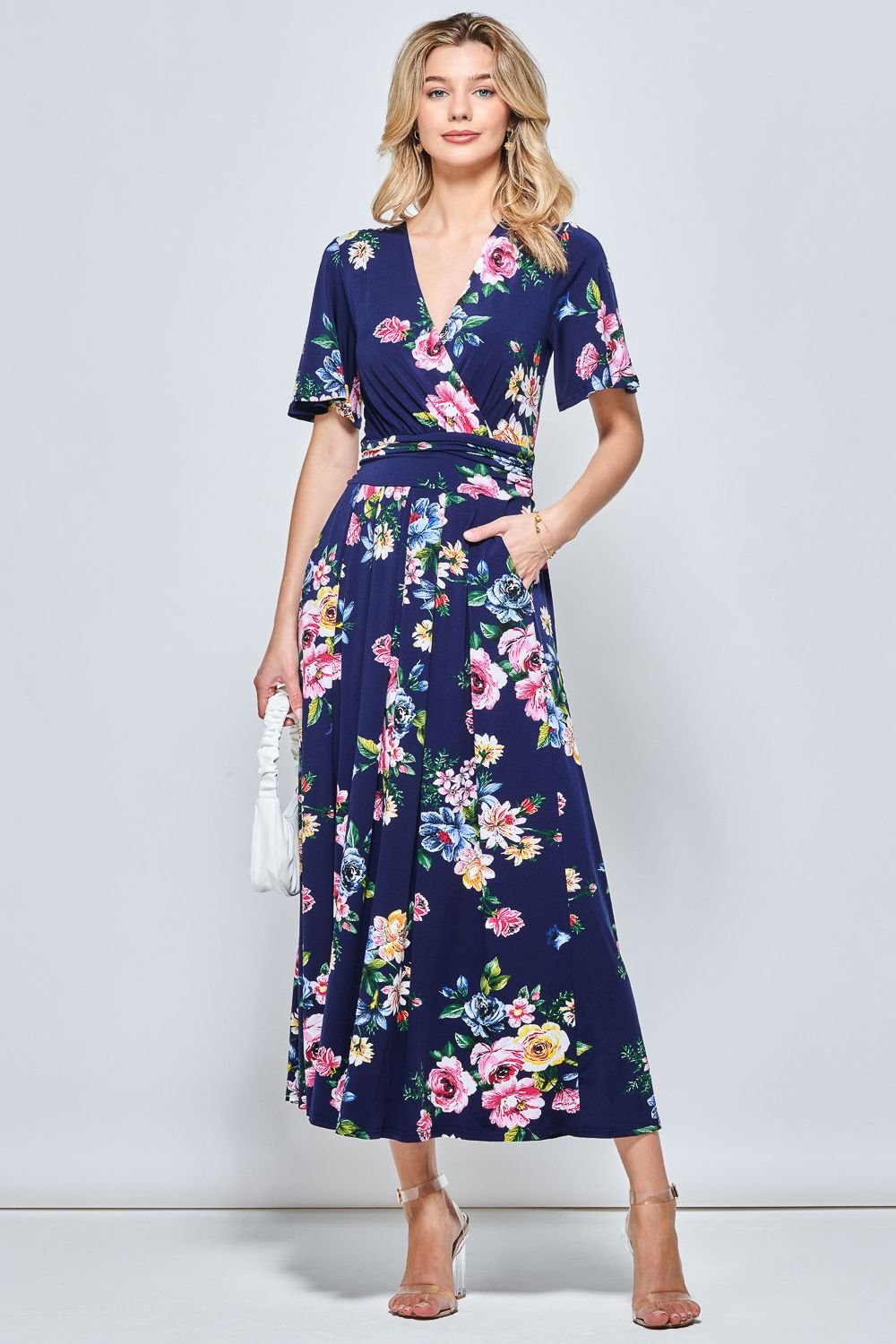 This blue floral jersey maxi dress from Jolie Moi features a wrap-around V-neckline and angel sleeves. The maxi length and soft drape make it perfect for any occasion.