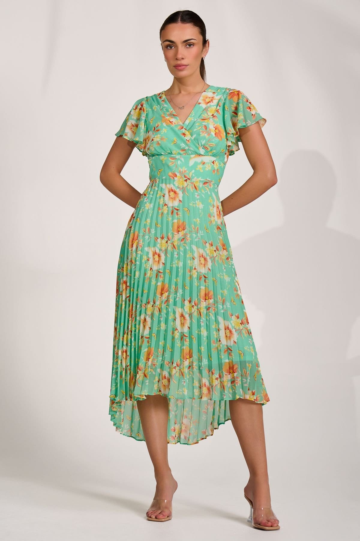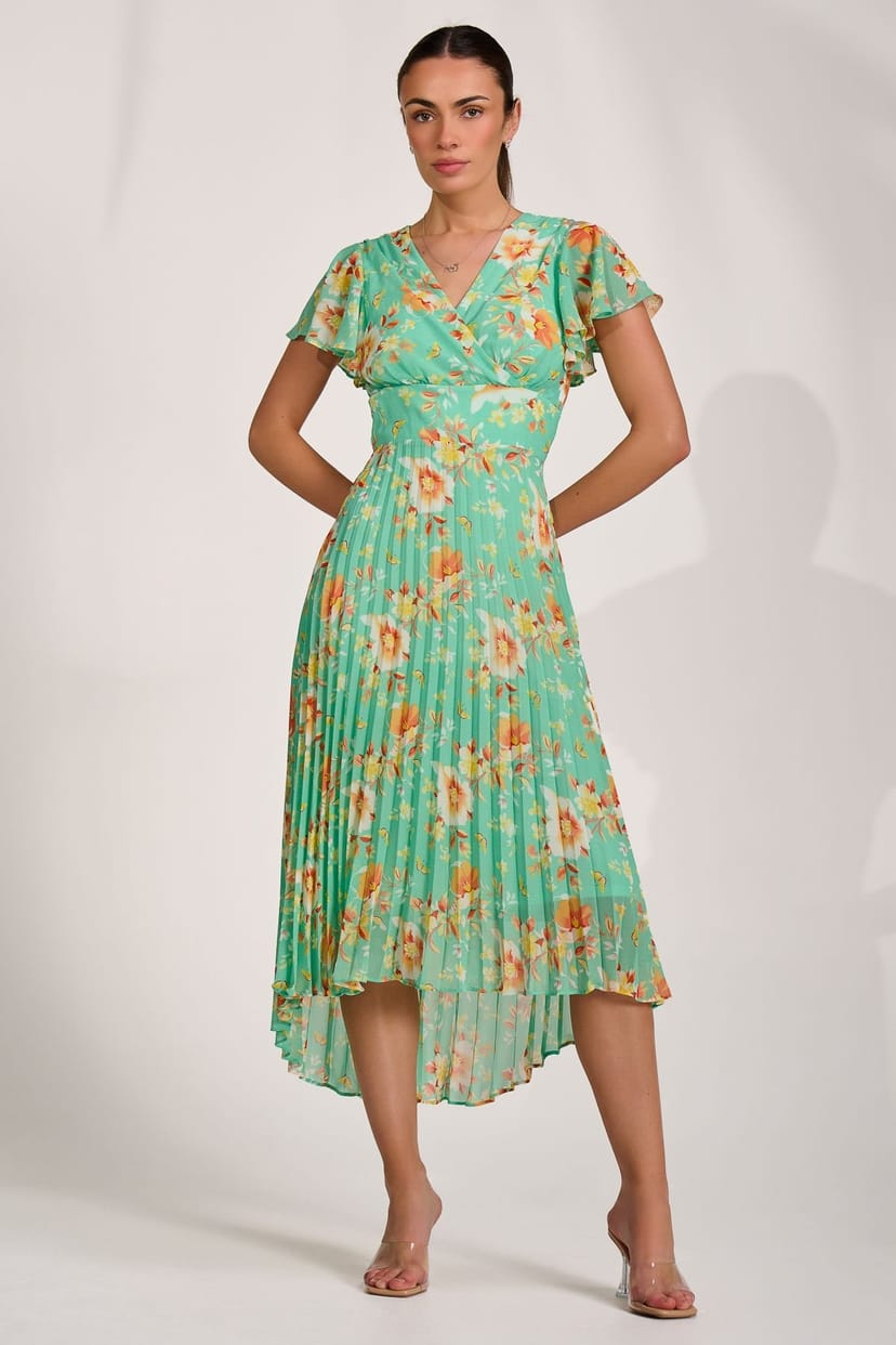 This bright green floral maxi dress by Jolie Moi features a wrap front, V-neckline, and a thicker waistband flowing into a pleated skirt. Designed with a high-low hem and short, flowy sleeves. Finished with a concealed zip at the back and fully lined for comfort.