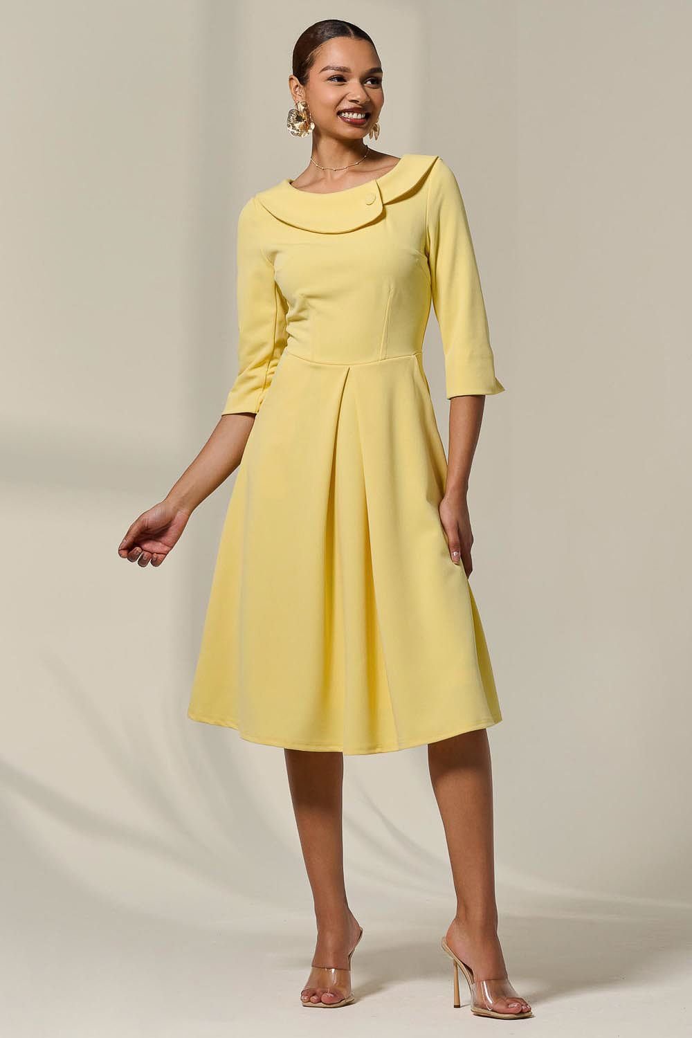 Retro-inspired 50's style midi dress from Jolie Moi. Crafted from luxury ponte-de-roma viscose with a hint of stretch, this fit and flare dress features a statement asymmetric Peter Pan collar with a smart button. Fully lined for comfort.