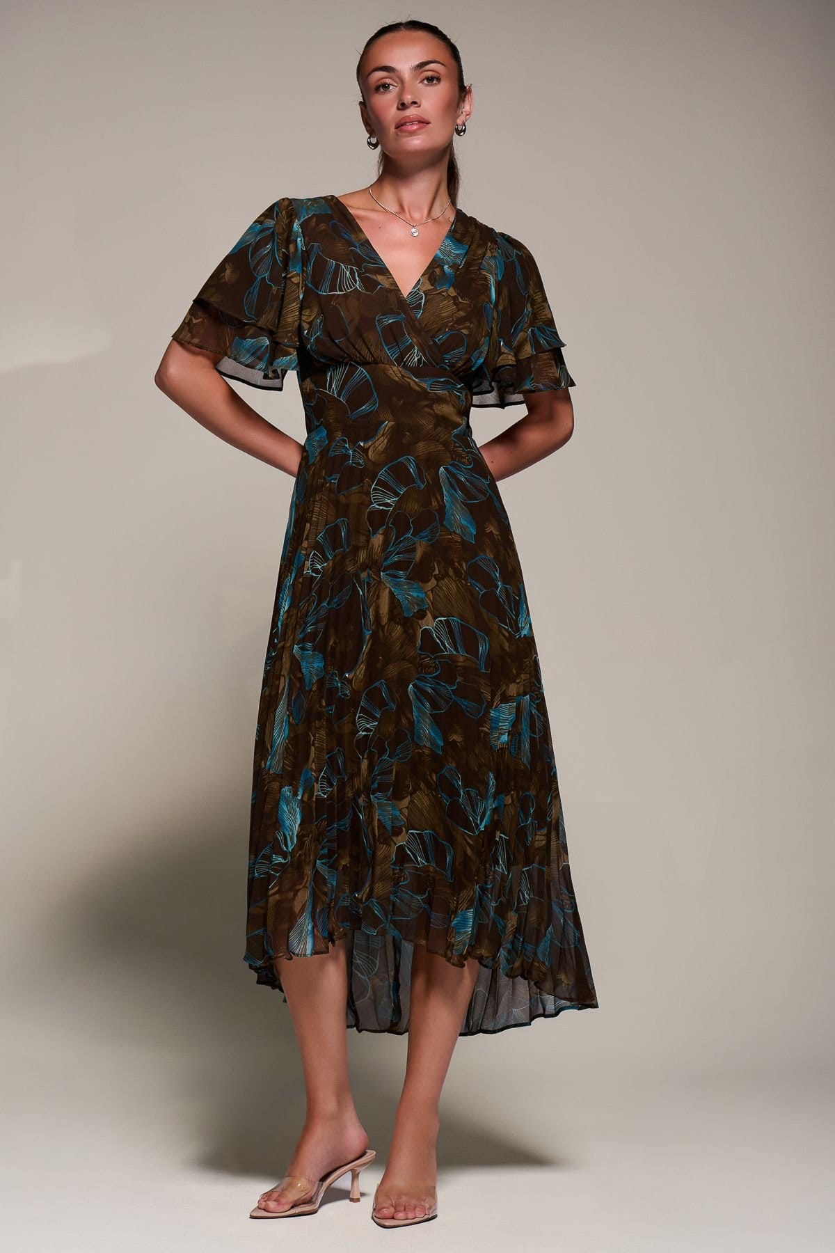 Dreamy midi dress in brown chiffon with a flattering V-neckline and floaty, ruffle angel sleeves. The pleated skirt flows into an asymmetric hem for added movement and elegance.