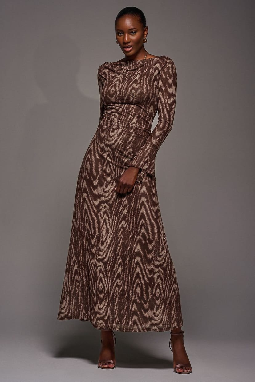 The Jolie Moi Brown Abstract Print Slash Neck Maxi Dress is available in sizes 10, 12, 14, 16, 18, 8.