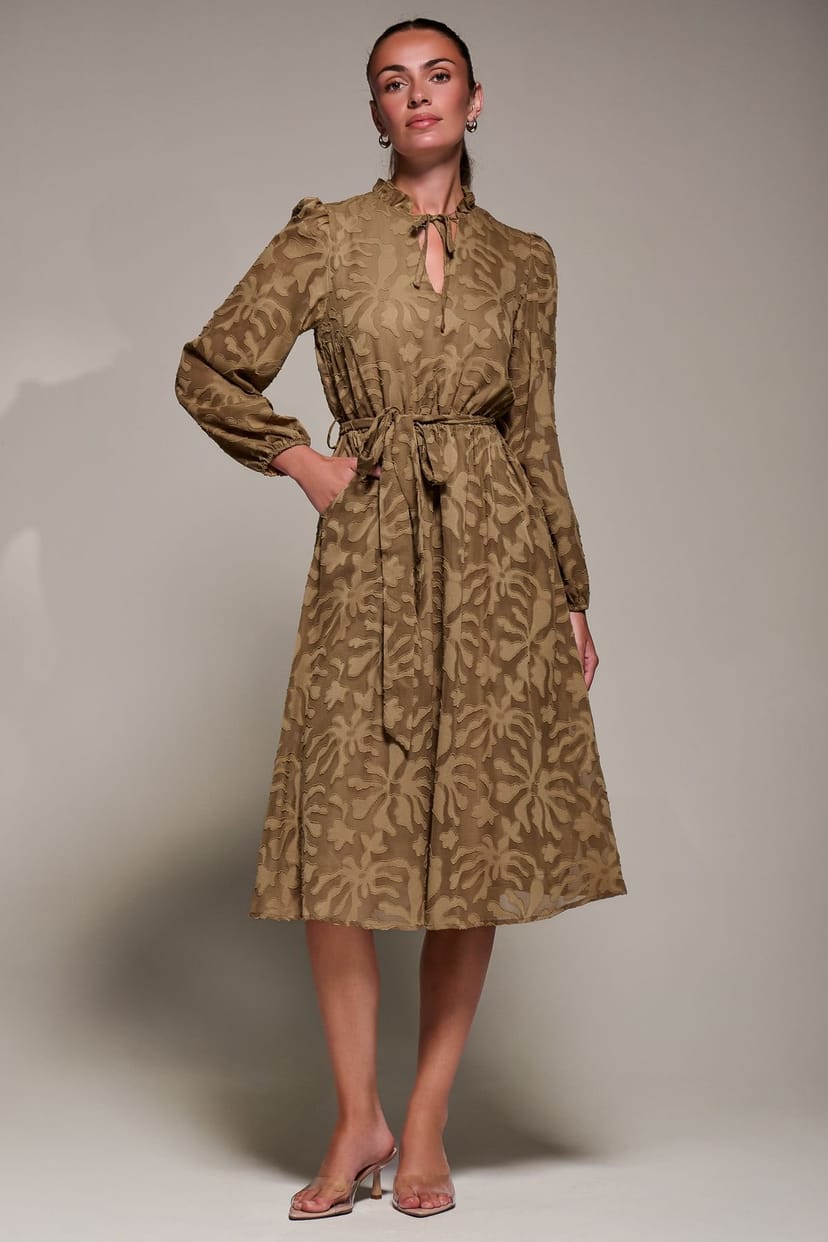 The Jolie Moi Brown Chiffon Midi Dress with Tie Neck is made from chiffon.