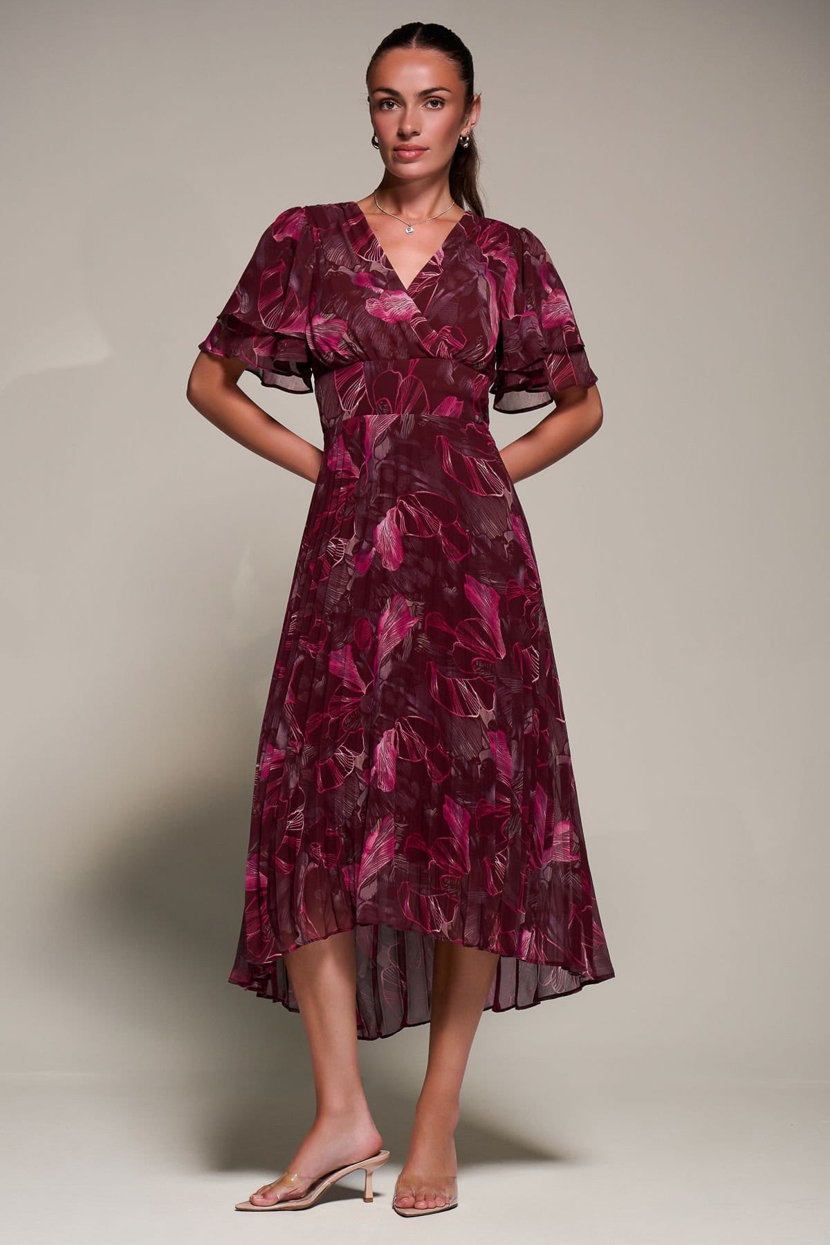Dreamy midi dress in burgundy chiffon with a flattering V-neckline and floaty ruffled angel sleeves. The pleated skirt flows into an asymmetric hem for added movement. Ideal for special occasions.