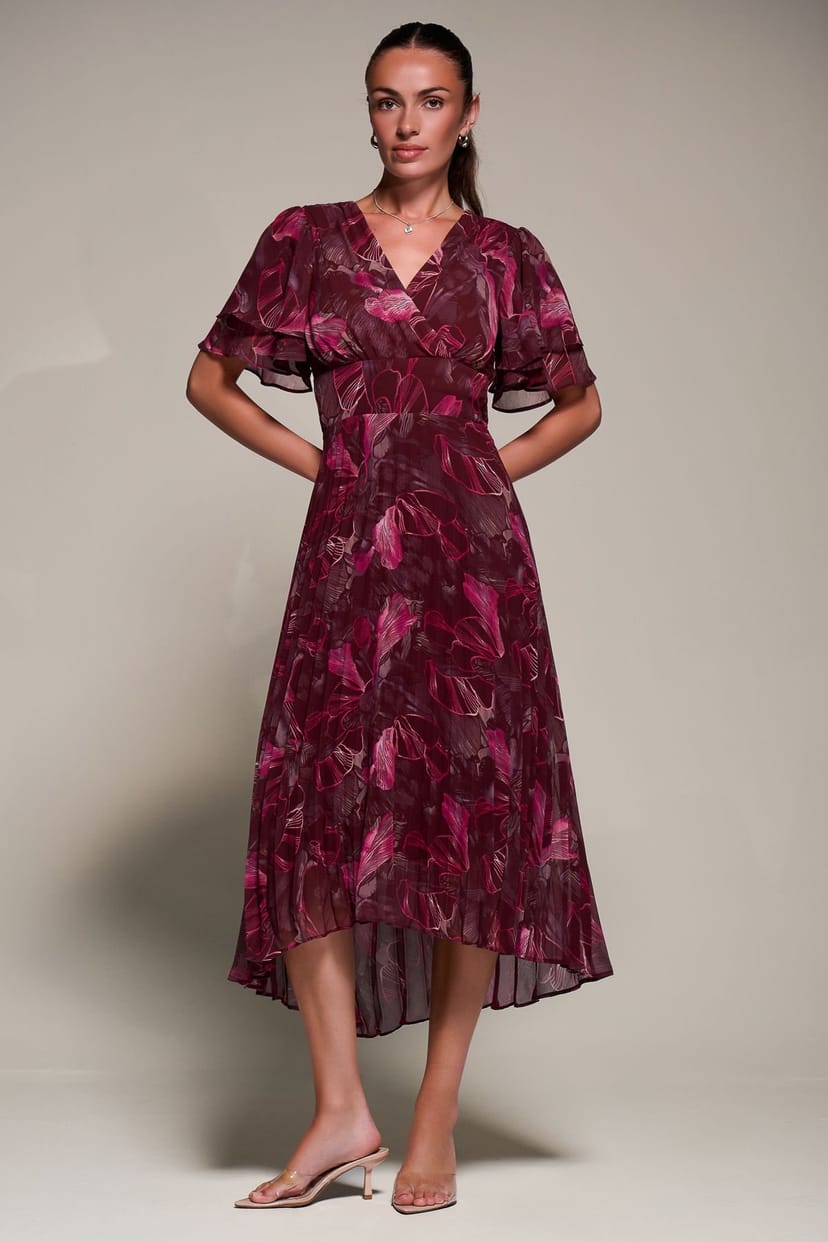 The Jolie Moi Burgundy Chiffon Midi Dress with Angel Sleeves is available in sizes 10, 12, 16, 18, 8.